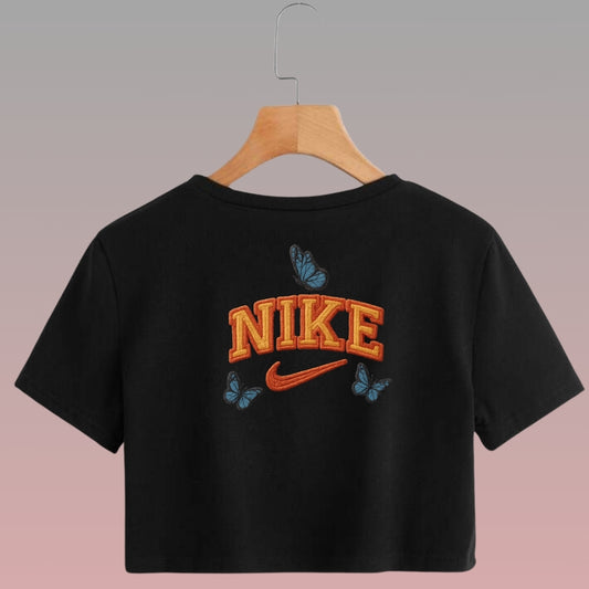 Crop Top Nike Manga Corta de Mariposas Azules Estilo Bordado / Negro