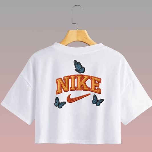 Crop Top Nike Manga Corta de Mariposas Azules Estilo Bordado / Blanco